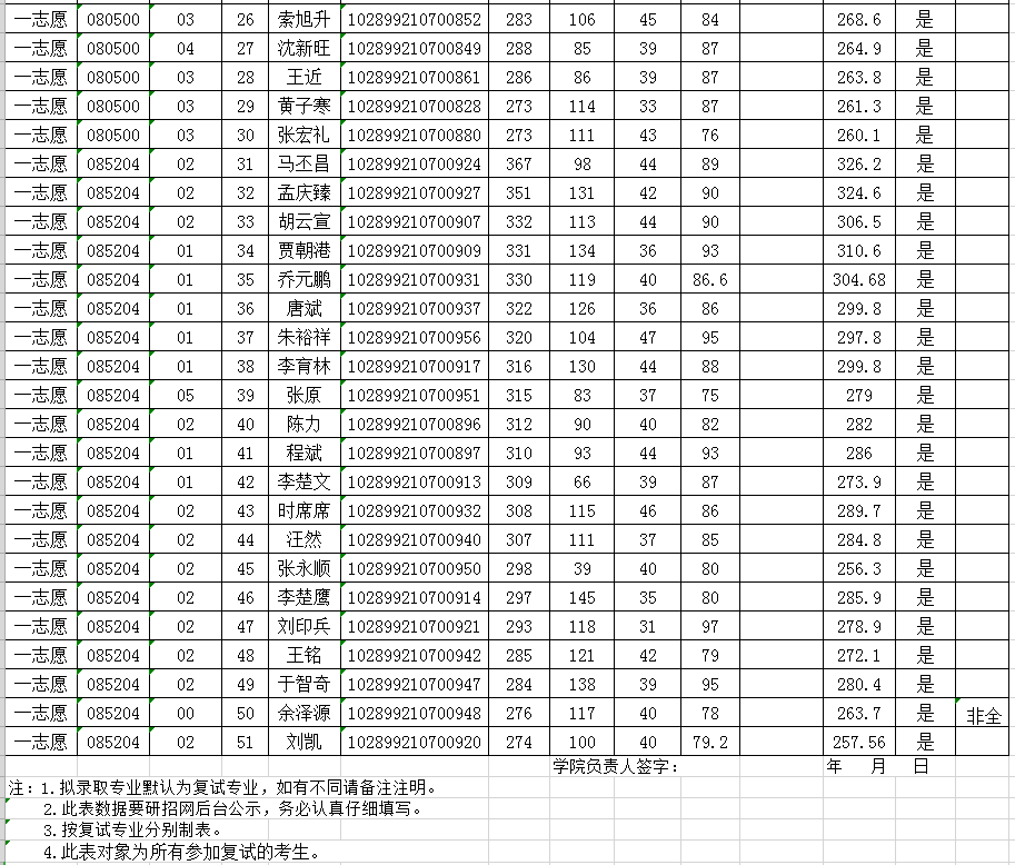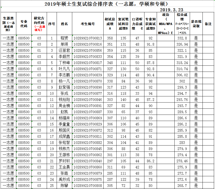 (一志愿,学硕和专硕)2019年硕士生复试综合排序表