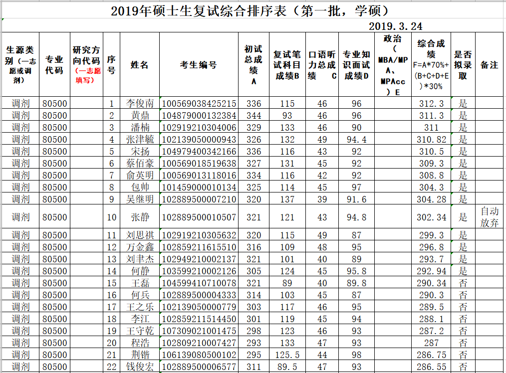 (第一批调剂,学硕)2019年硕士复试综合排序表