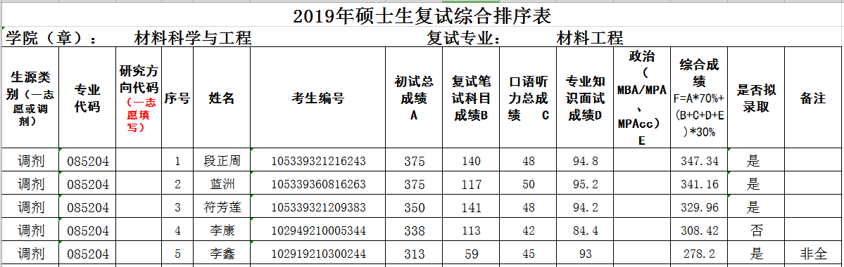 (第三批调剂,专硕)2019年硕士复试综合排序表