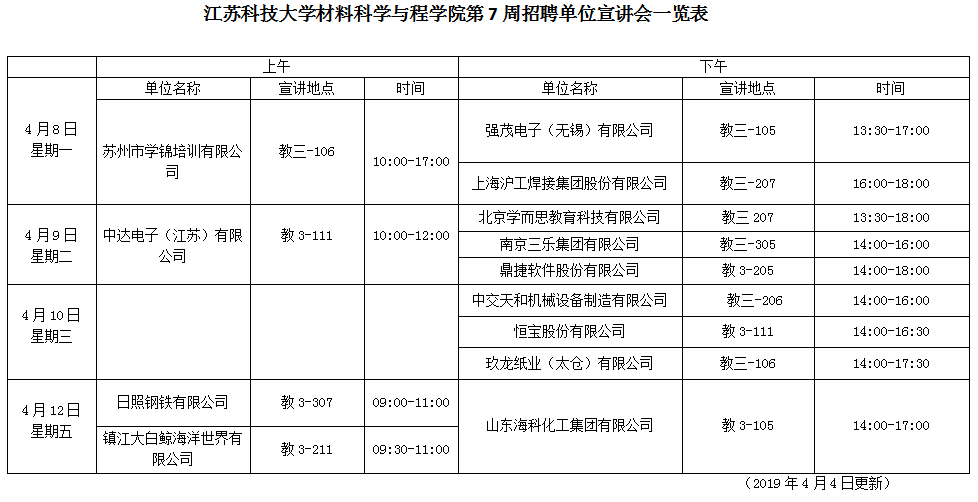 招聘会|太阳成集团tyc第7周招聘单位宣讲会一览表(2019年4月4日)