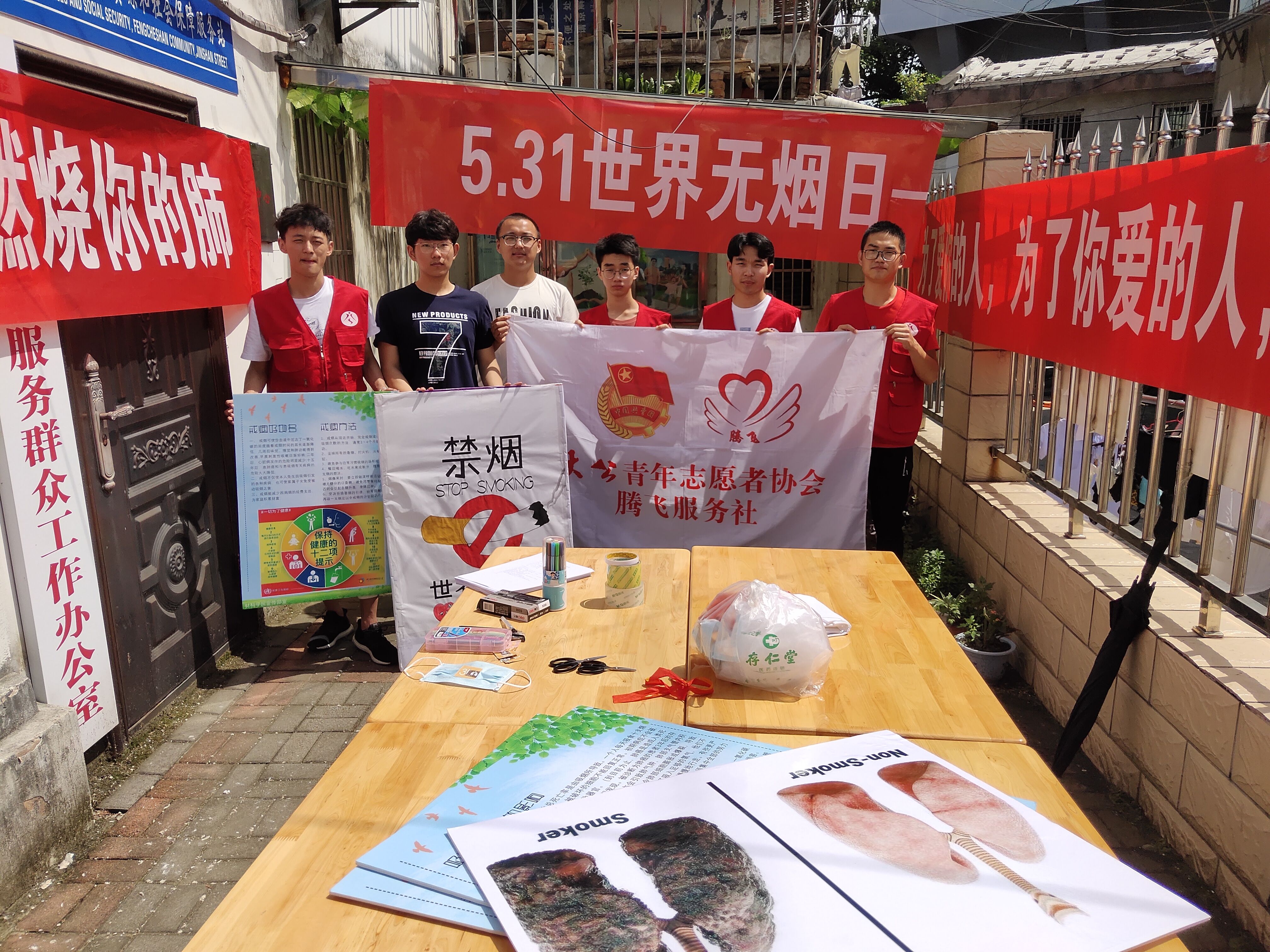 在世界无烟日到来之际,为提倡禁止吸烟,拥抱健康生活。5月29日上午,太阳成集团tyc腾飞志愿者服务社来到风车山社区开展以“拒绝烟草,拥抱健康”为主题的志愿活动。学院团委指导老师李文达来到现场指导活动。