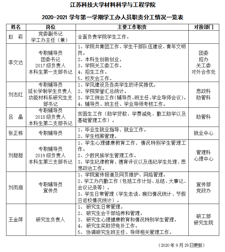 2020-2021学年第一学期学工办人员职责分工情况一览表
