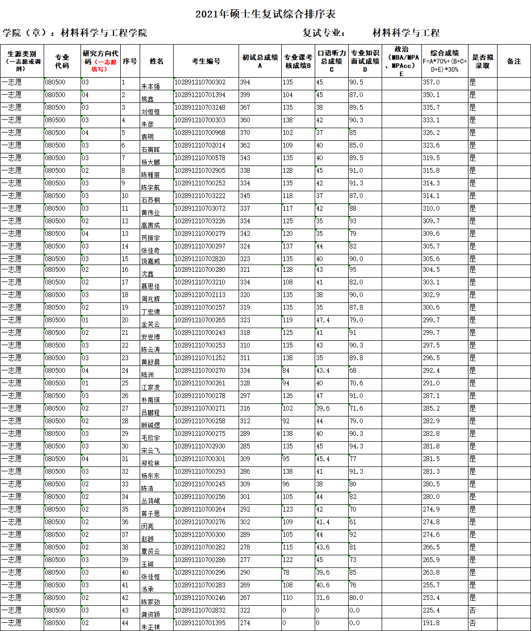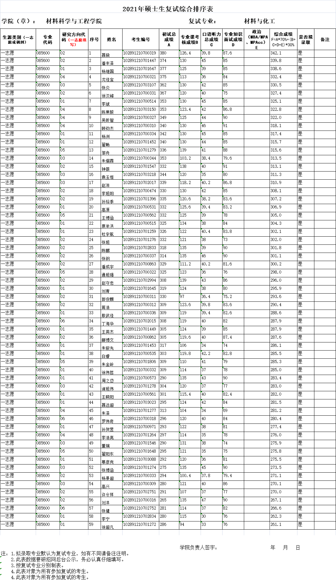 考研公示|2021年硕士生复试综合排序表(一志愿)
