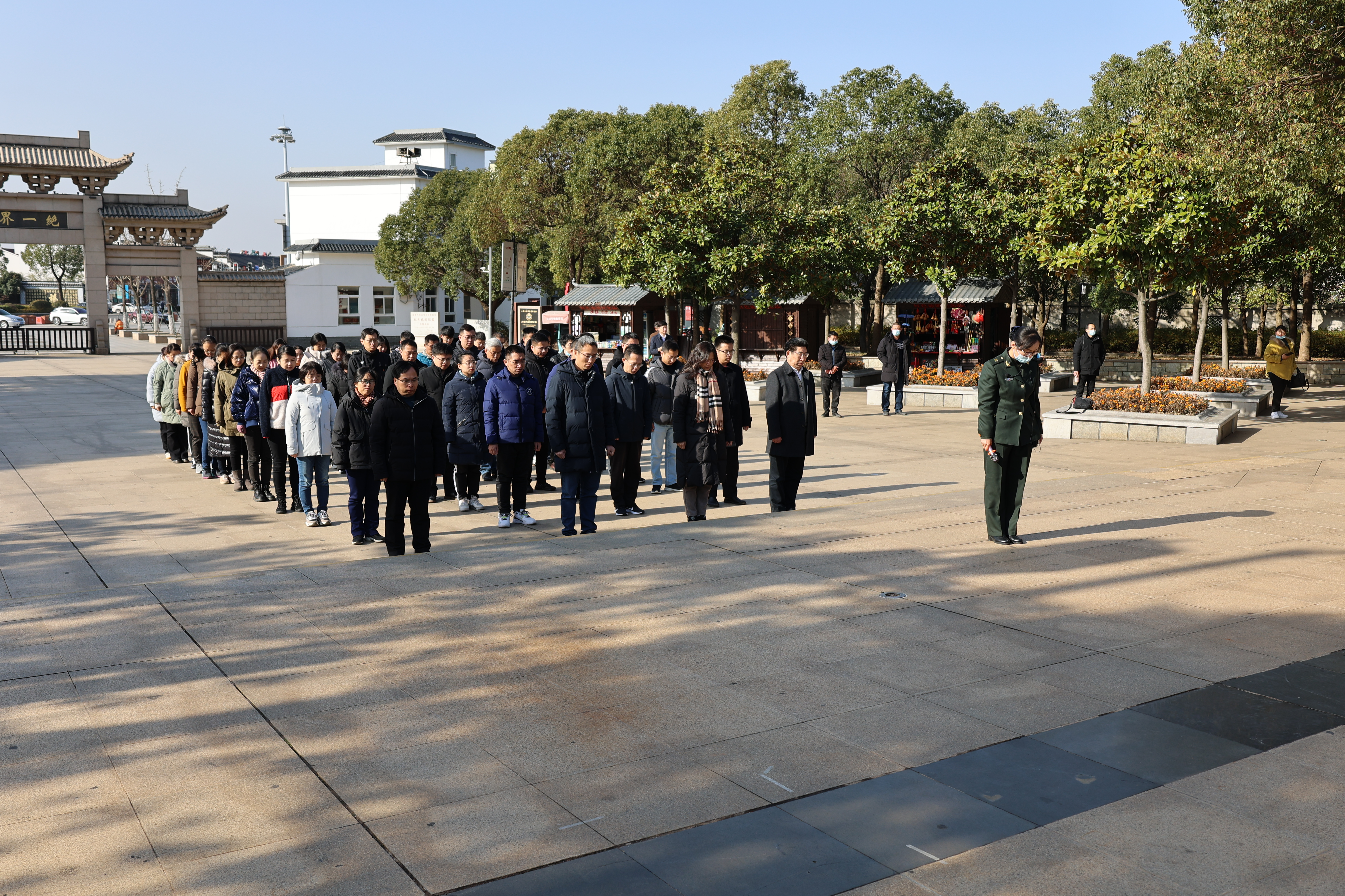 在屹立于茅山脚下、被苍松翠柏环绕着的苏南抗战胜利纪念碑前,教师们向革命烈士敬献花篮并默哀悼念,追思和缅怀为挽救民族危亡、在硝烟炮火中壮烈牺牲的烈士们。在雄伟壮丽的纪念碑前,教师们领略到了“碑下放鞭炮,空中响军号”的神奇现象。回旋嘹亮的军号声中,大家仿佛看到了新四军们英勇向前、浴血奋战的宏大场面。当年冲锋的号角,给奋勇前进的战士一鼓作气的勇气,也给了教师们开拓进取的决心。