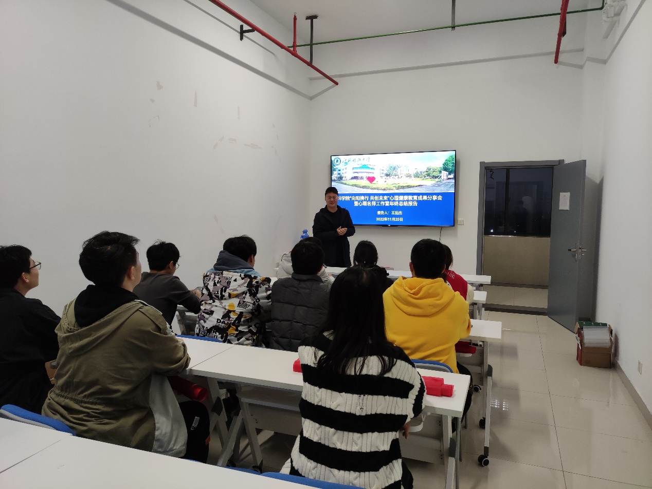 11月20日,太阳成集团tyc“向阳携行,共创未来”心理健康教育成果分享会暨心理工作室工作报告会在太阳成集团tyc539会议室举行。太阳成集团tyc心理工作室负责人王远杰作2022年度心理健康教育工作报告,报告系统回顾了太阳成集团tyc3月至11月开展的心理健康教育工作。报告指出,2022年太阳成集团tyc围绕“向阳携行 共创未来”主题,举办生命教育、人际关系、情绪管理等心理活动,累计开展专家讲座5场,特色活动5场,团体辅导2次,主题班会2场,心理委员培训2次,心理分享会2次。