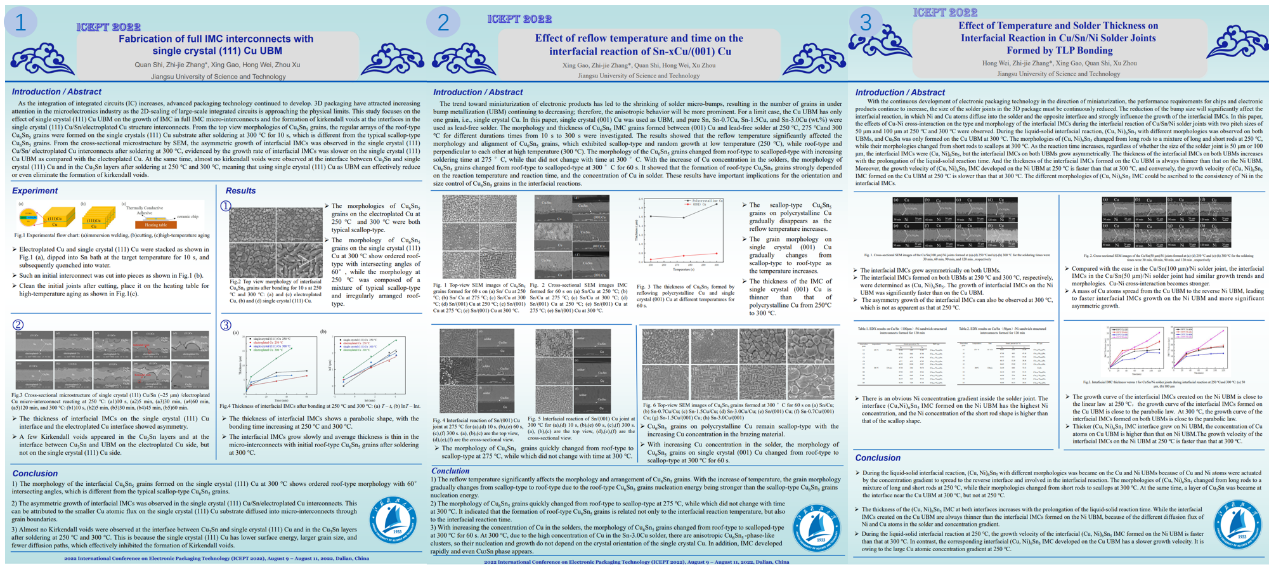 本次会议设置了“先进封装”、“封装材料与工艺”、“封装设计、建模与仿真”、“互连技术”、“M封装制造技术与设备”、“质量与可靠性”、“功率电子”、“光电器件封装”等10个主题,7个分会场。公司功能材料系青年教师张志杰副教授及研究生施权、高幸和魏红聆听了汪正平院士、郑力先生、黄明亮教授、刘志权教授、于大全教授等知名学者的大会专题报告及大会论坛报告,在“互连技术”专题中做了“Fabrication of full intermetallic compound interconnects with single crystal (111) Cu under bump metallization”, “Effect of reflow temperature and time on the interfacial reaction of Sn-xCu/(001) Cu”, “Effect of Temperature and Size on Interfacial Reaction of Cu/Sn/Ni Solder Joints”三个展板,并就目前课题组已有成果和存在的问题向专家和同行进行讨论交流。