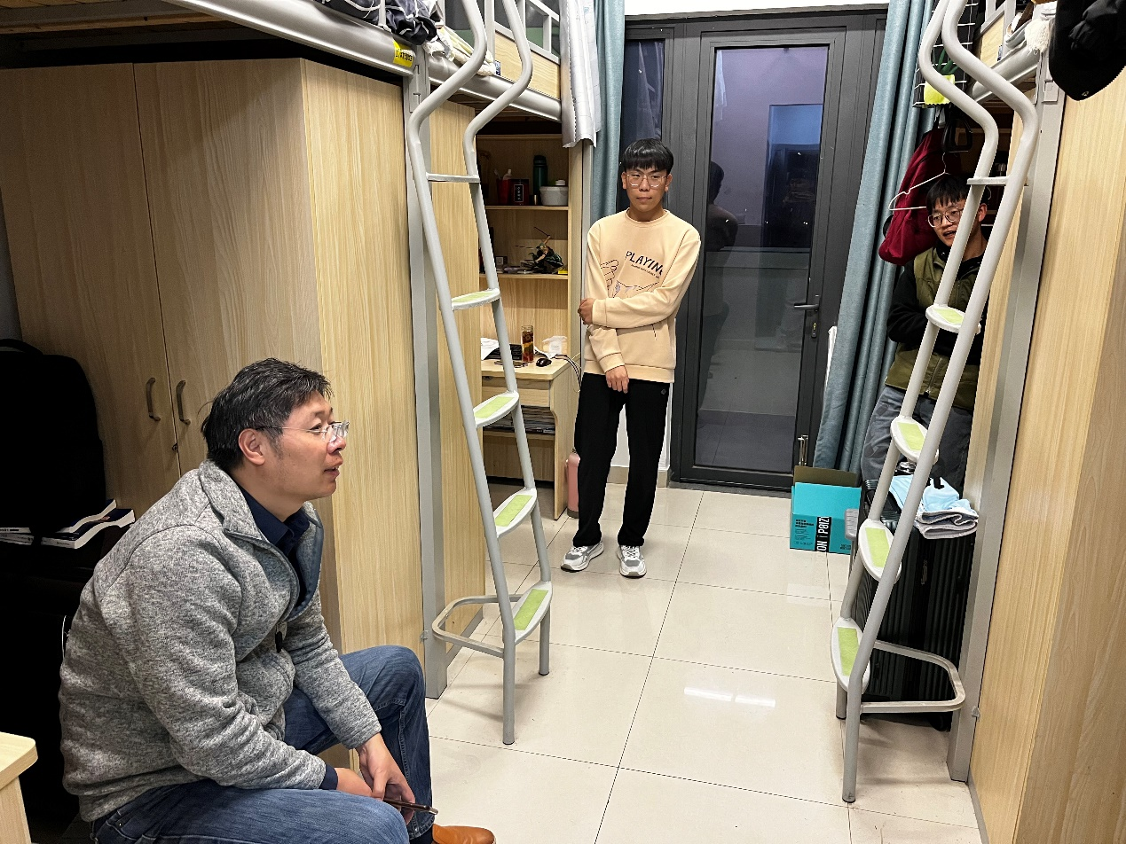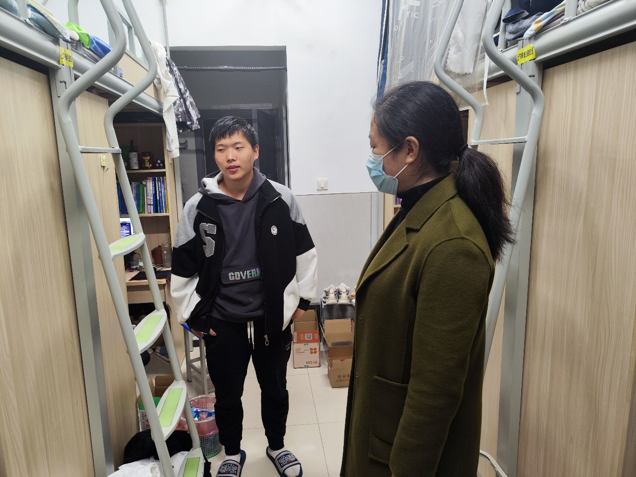 进入宿舍后,晏经理与同学们亲切交谈。作为学业导师,晏经理了解班级每一名同学的情况,关心学习存在困难的同学有没有做好复习准备,省外的同学假期回家有没有难度。在403宿舍,晏经理询问大家有没有经常锻炼身体,体质测试有没有顺利通过,并向同学们分享了自己求学的经历,告诫同学们不要沉迷游戏,希望每位同学走出宿舍,走进图书馆,制定好学习计划,劳逸结合,丰满自己的老员工活,不留遗憾。晏经理对大家的谆谆叮嘱,让大家都备受鼓舞,纷纷和老师定下学期不挂科、明年努力考研的约定。