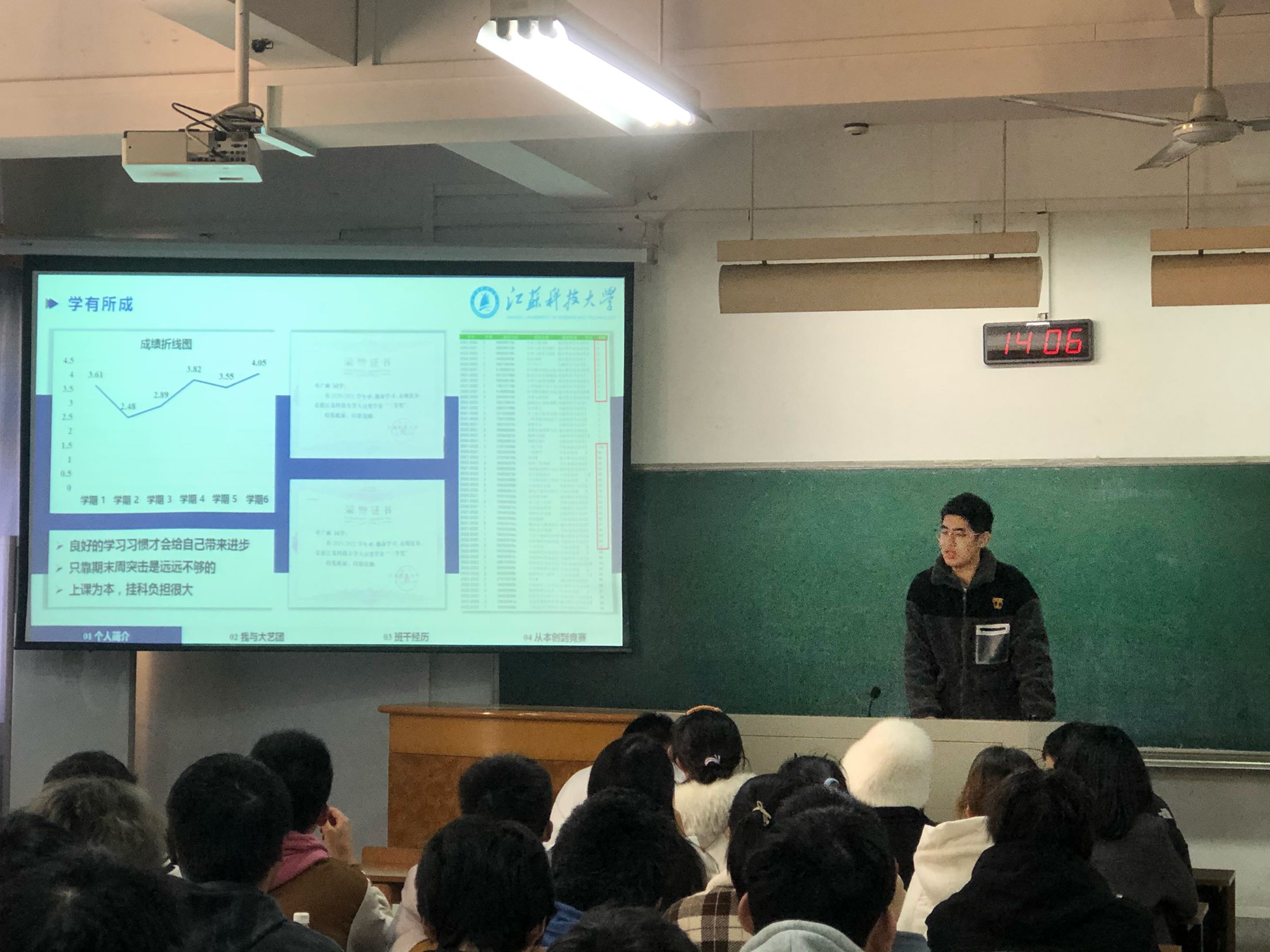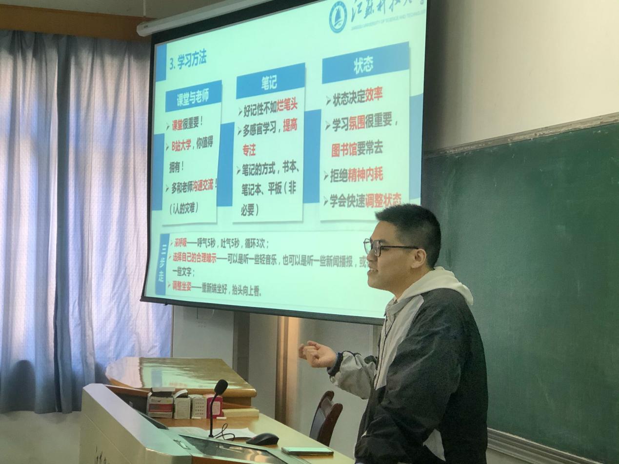 宋典学长建议同学们首先要在学习与生活的衡量上学会取舍,切忌不劳而获。在学习上,基础课程一定要掌握牢固,困难学科不必刨根问底;利用好课堂和“ B站大学”,抓住重点,吃透书本,多思考,多动脑,多问为什么;要尽早通过英语四六级考试;及时记录课堂重要知识点,结合作业总结复习笔记,期末时通过平时笔记快速复习;其次,要经常去图书馆,良好学习氛围会提高学习效率,事半功倍。最后,拒绝精神内耗,学会快速调整状态,主动交流,不做i人,锻炼自我。