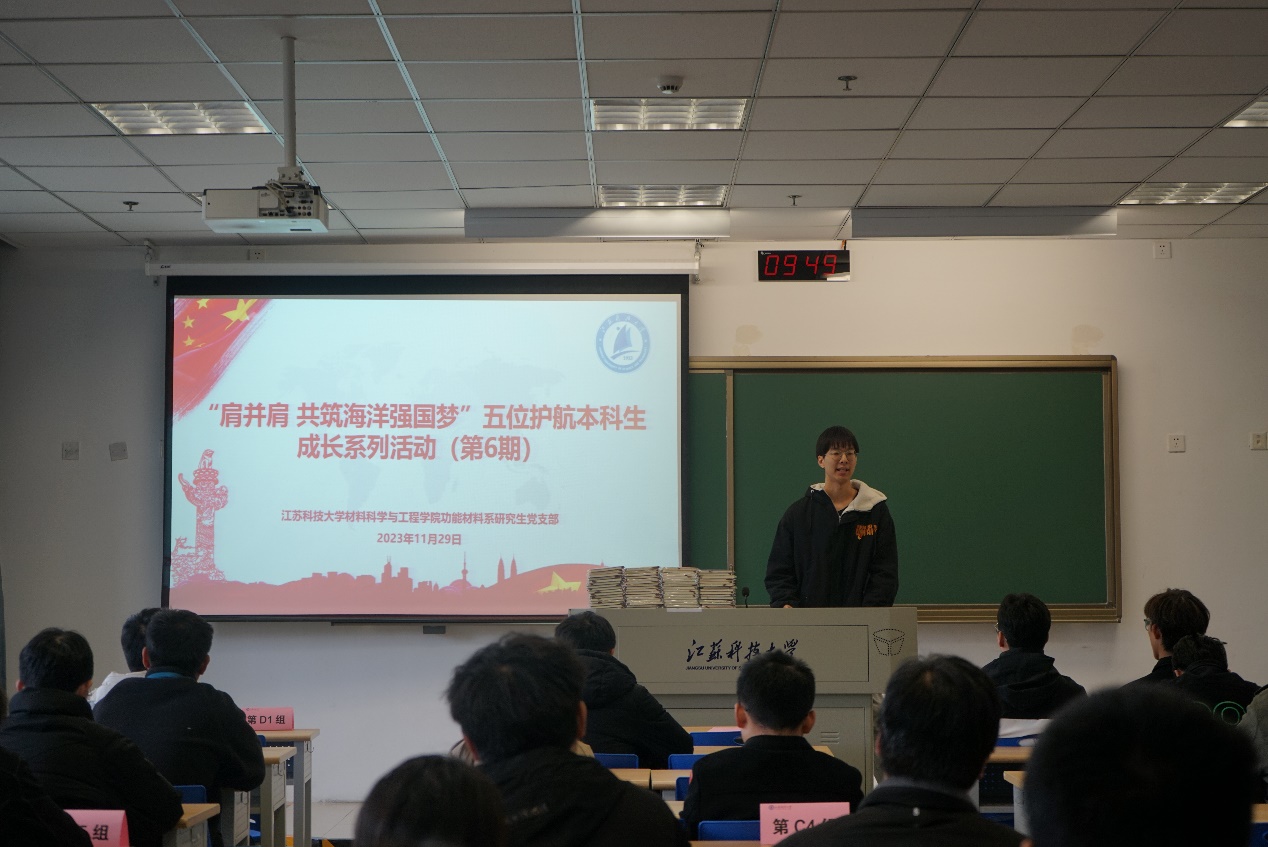 支部书记刘志红介绍了“肩并肩,共筑海洋强国梦”五位护航本科生成长系列活动的内容及意义,并分享以往活动照片、工作记录及工作成效。