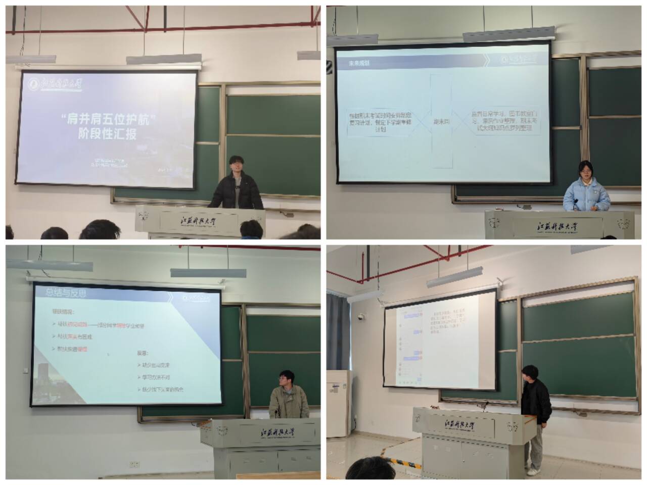 3月14日,研究生党员袁浩涵、陈家源、华亿源、张帆分别代表参与2023年下半年五位护航工作的四个研究生党员小组汇报了护航工作进展和工作成果,包括第五期五位护航小组研究生组与本科生线上线下交流的情况、受学业预警本科生的学习状况、预警的具体原因和解决办法、预警改善情况、后续护航计划等。