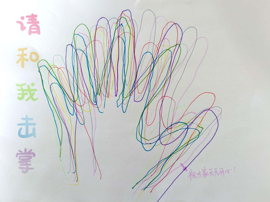 活动的最后,大家击掌为盟,共谱欢乐颂。参与者们选取自己喜欢的颜色,在同一张白纸上按下手掌并画出轮廓,约定好一起快乐出发,告别焦虑!