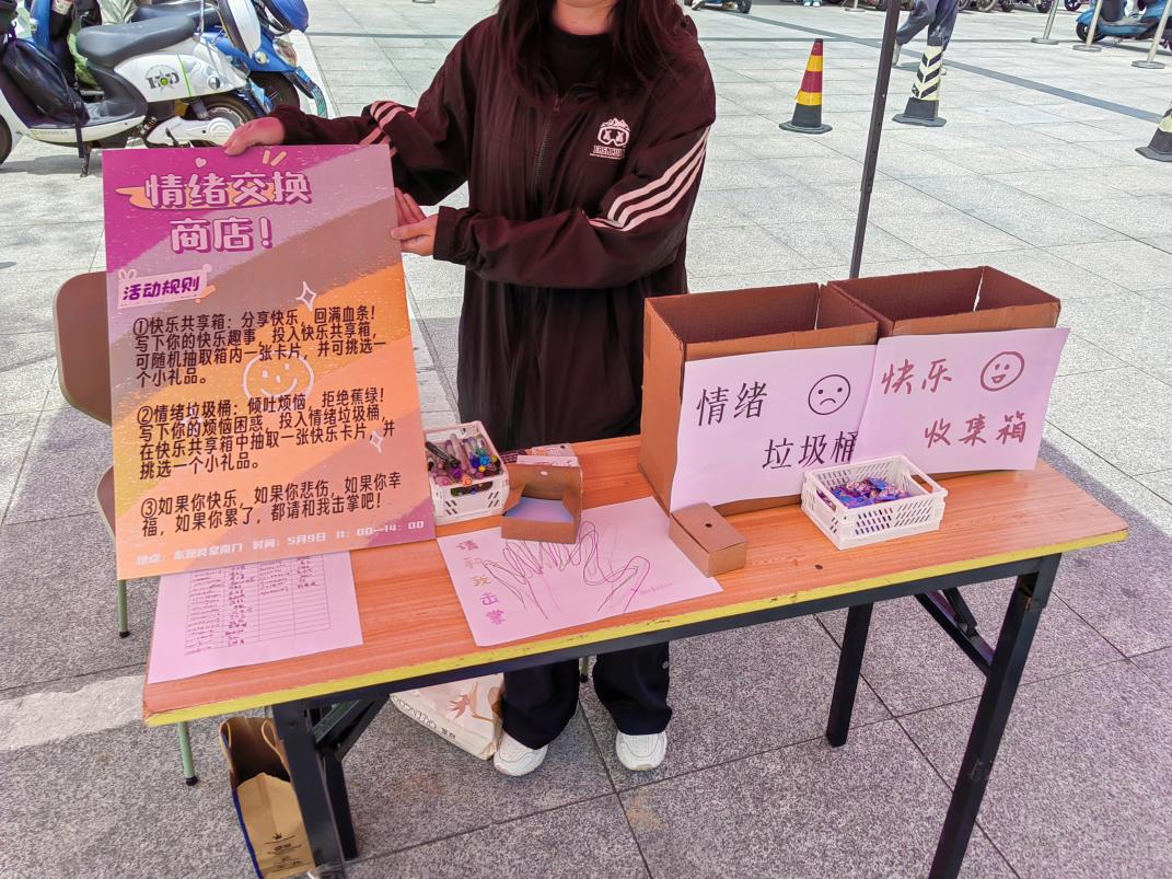 5月9日,活动在长山校区东苑食堂门口拉开了帷幕。桌子上摆放着两个箱子,上面分别写着“快乐共享箱”和“情绪垃圾桶”。“快乐共享箱”是同学们共同的快乐仓库,参与者们纷纷书写下自己的幸福瞬间,这些美好的回忆充实了大家的快乐库存。通过分享,参与者们不仅感受到了个体的欢笑,更激发了共同的快乐能量,为这个夏天填充进美好的独家记忆。