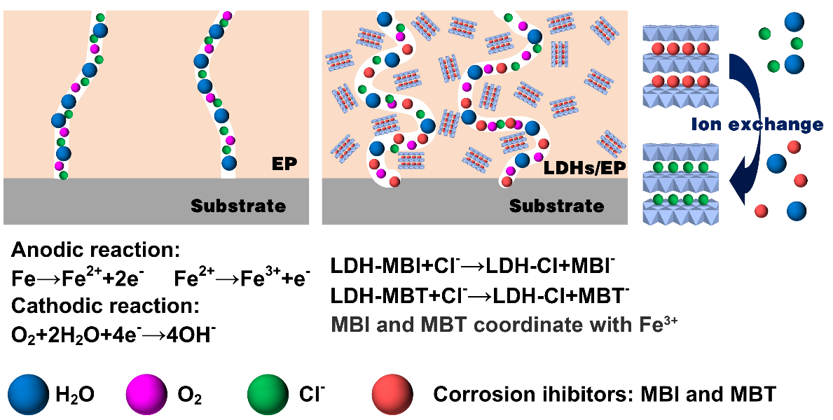 为更好地提升海洋腐蚀环境中有机高分子基复合涂层对金属基材的防护性能,尤其是掌握高Cl-含量腐蚀环境下有机高分子复合涂层的离子刺激响应以及自修复机理,李照磊课题组围绕纳米负载容器的设计与合成,以及以缓蚀剂负载纳米容器为填料并最终制备有机高分子基复合涂层展开了系统研究。在上述论文中,课题组首先制备了镁铝层状双金属氢氧化物,并向其中成功负载了有机缓蚀剂分子2-巯基苯并咪唑或2-巯基苯并噻唑。论文深入细致地探究了有机缓蚀剂向镁铝层状双金属氢氧化物中负载的过程以及不同Cl-含量腐蚀介质中有机缓蚀剂从镁铝层状双金属氢氧化物向外释放的动力学行为。进一步地,课题组又制备了以有机缓蚀剂负载镁铝层状双金属氢氧化物作为填料,环氧树脂为主要成膜物质的复合涂层。通过系统地研究,课题组发现含有有机缓蚀剂负载镁铝层状双金属氢氧化物的复合涂层的阻抗值比纯环氧树脂涂层的阻抗值要高2个数量级,而且复合涂层在受损后表现出了海洋高盐含量腐蚀环境下优异的Cl-刺激响应主动防护特性。最终,论文中着重阐明了复合涂层优异耐腐蚀性能与主动防护特性的相关机理。该研究可为海洋等高盐严酷腐蚀环境中金属结构材料的防护提供重要的理论参考,且所制备的高分子复合涂层具有明确的应用价值。