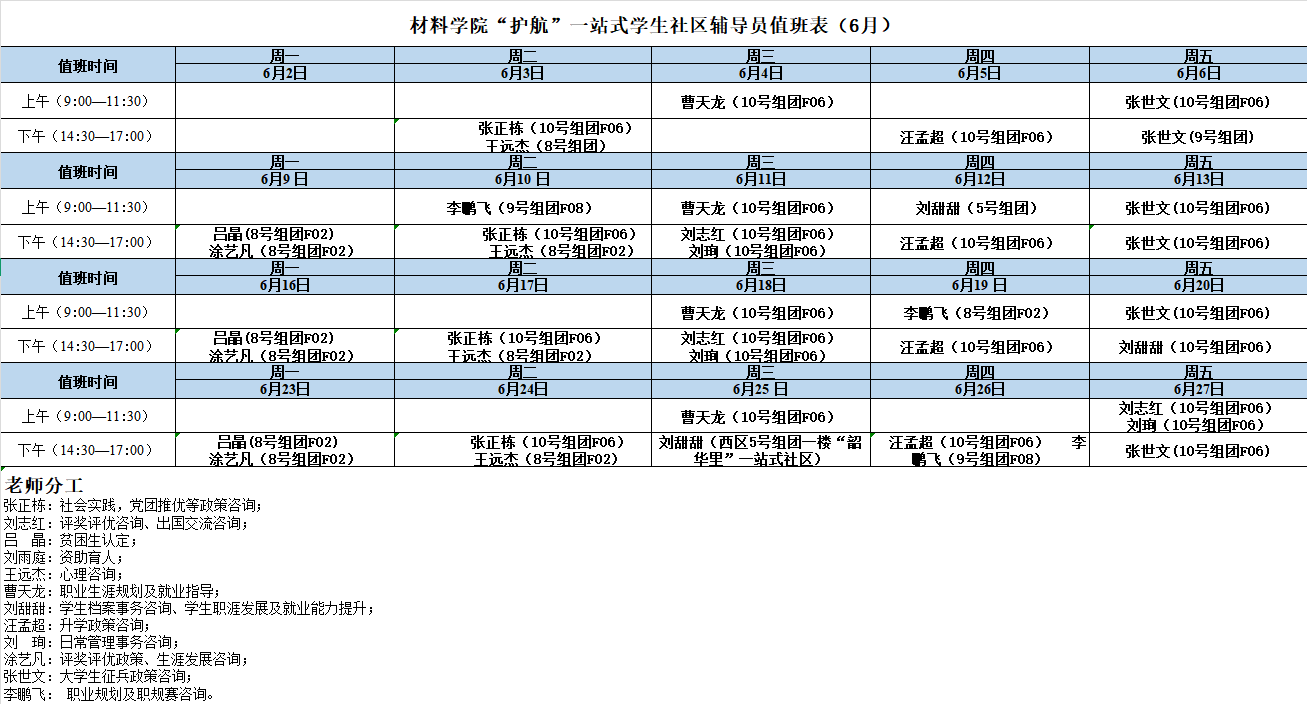 太阳成集团tyc“护航”一站式员工社区辅导员值班表(6月)